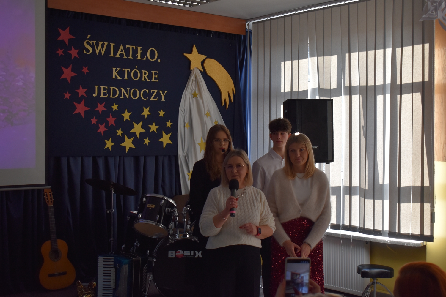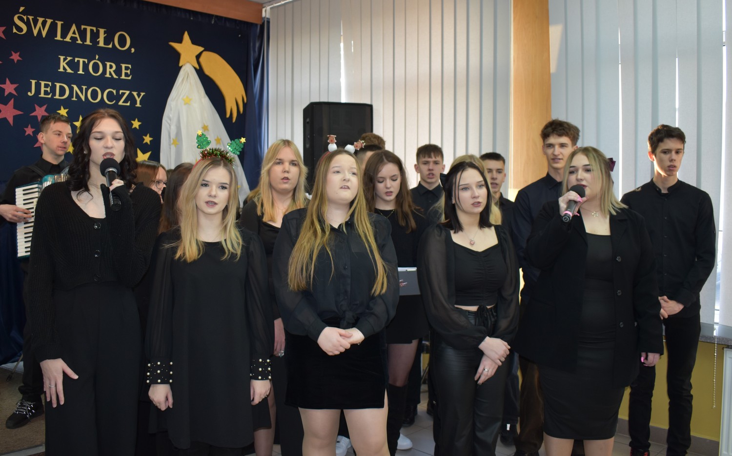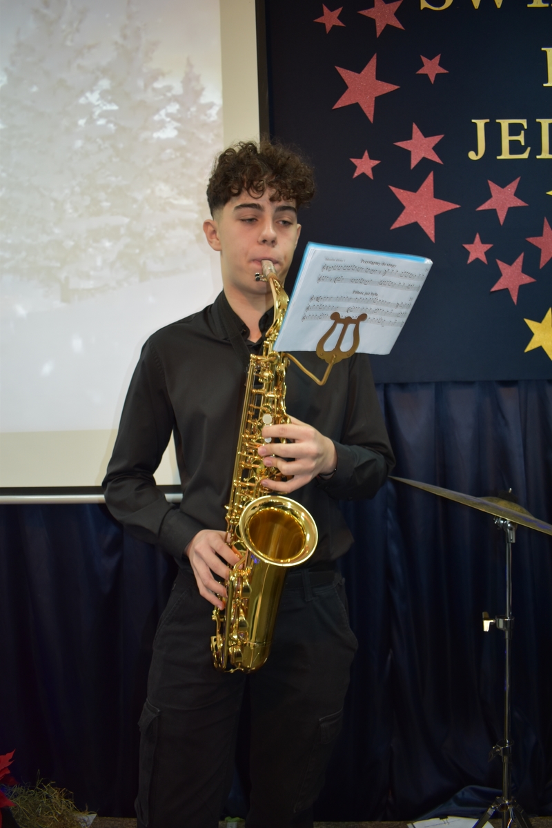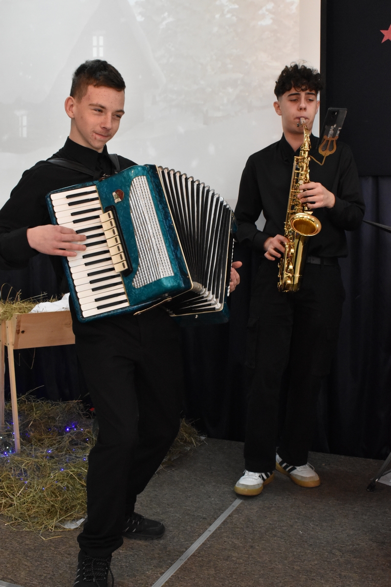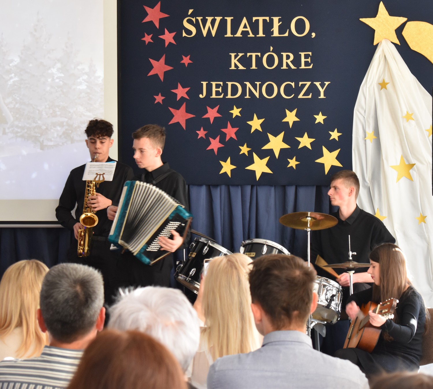 Zwieńczeniem akademii był wyjątkowy koncert kolęd i pastorałek. Młodzież, przy akompaniamencie perkusji, saksofonu, gitary klasycznej oraz akordeonu, przypomniała najpiękniejsze polskie kolędy. W finale do wspólnego śpiewu dołączyli wszyscy zgromadzeni – było radośnie, wzruszająco i bardzo świątecznie.